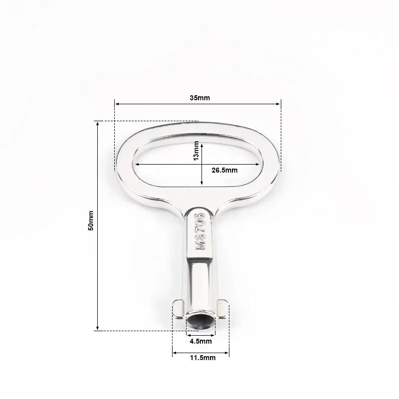 ニッケルメッキのアルミニウム二重ビットキー:全体の寸法35×50mm、ロックシリンダーセンターの直径4.5mm、ロックシリンダーセンター +二重歯直径11.5mm。