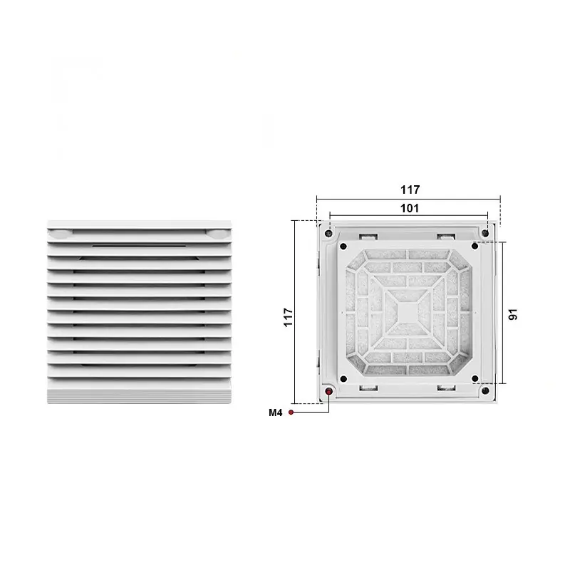 設置前にキャビネット開口部の寸法を確認し、同じサイズの換気窓の機種をお選びください。締め付けるときは、力が均等になるように、斜めに順番にネジを締めてください。ファンが正常に動作していることを確認するには、毎月埃の蓄積を確認し、必要に応じて掃除してください。